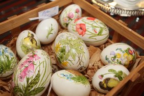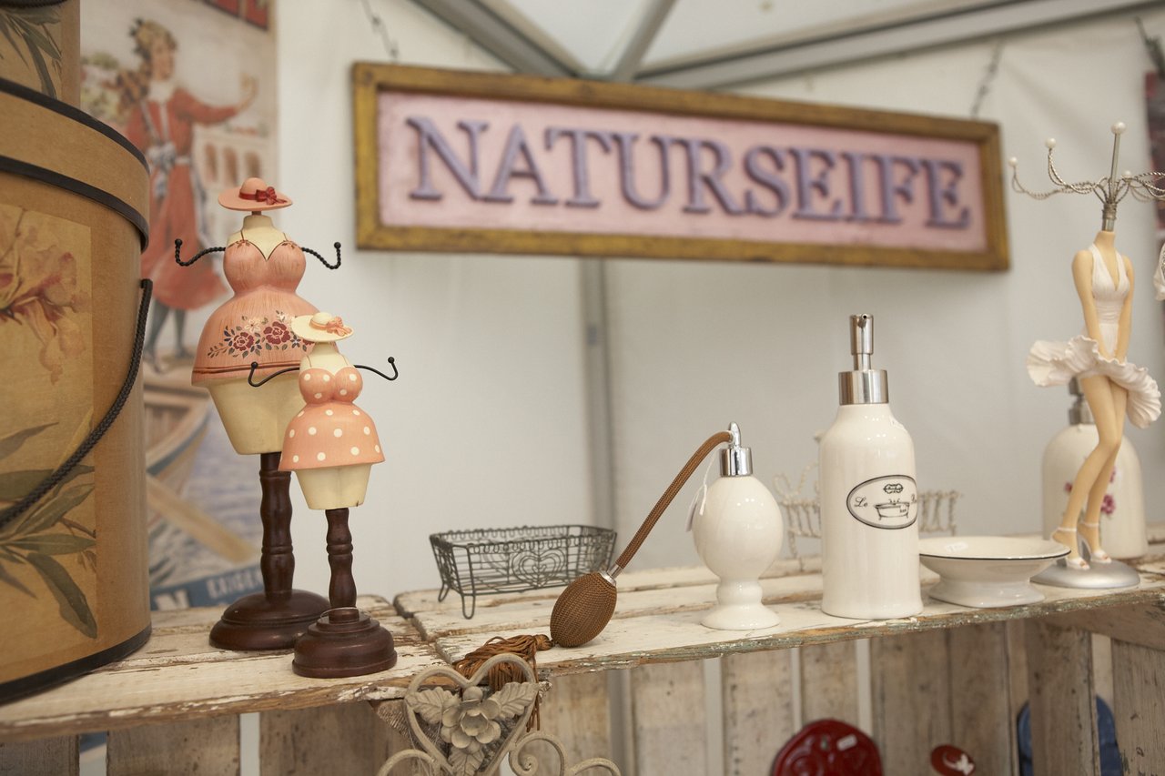 Stände mit Wein, Gewürzen, Dips, Pestos, Käse und Brotspezialitäten reihen sich an solche mit Gartenbänken, Grills und aus Altmetall gearbeiteten Kunstobjekten. Grün kariert oder blau gestreift zeigen sich die Polster von Strandkörben während in Zartrosa oder Cremeweiß handgefertigte Seifen ihren Duft verströmen und dabei mit den Raumdüften vom Nachbarstand konkurrieren. Silberschmuck glitzert mit silbernen und gläsernen Tischaccessoires um die Wette, zierliche Häschen aus Porzellan machen neben bemalten Eiern eine gute Figur und die in Weiß, Grün und Rot gehaltenen Vogelhäuschen sind farbenfrohe Hingucker.